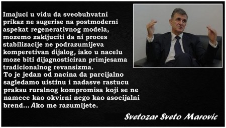 Znamo da je Marović patriota, patriota je uvijek bio: i kao ortodoksni komunista i kao zagovornik neoliberalizma, i ka branitelj SFRJ, i SRJ, i Zajednice Crne Gore i Srbije (čiji je jedno vrijeme bio predsjednik), i kao istaknuti suverenista i čuvar državnosti Crne Gore. Znamo i da je „filozofski“ izmislio i osmislio sintagmu „Rat za mir“, kojom smo krenuli u neviđenu bruku, pljačku Dubrovnika i okoline, kako bi „povukli neke pravednije granice od onih koje su crtali priučeni Titovi kartografi“.