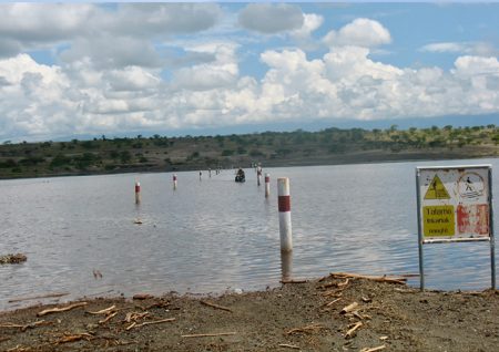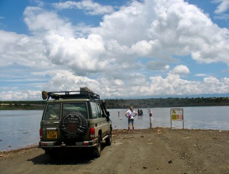 Daleko je druga obala, nemamo pojma koliko je voda duboka, razmisljamo. Lumbaji kaze da moze nas LANDROVER da to izvuce. I Capo kaze da moze, ali se isto dvoumi jer ako stanemo zaglavljeni u sred jezera, gotovo je za kola, a mi mozemo i pjeske nekako proci. Jezero je inace slano i naravno da nagriza boju a i djelove kola.
