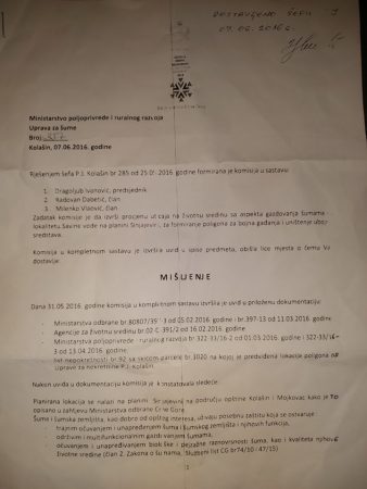 On je javnosti predočio i stav Ministarstva poljoprivrede i ruralnog razvoja, odnosno Uprava za šume, od 7.juna 2016.