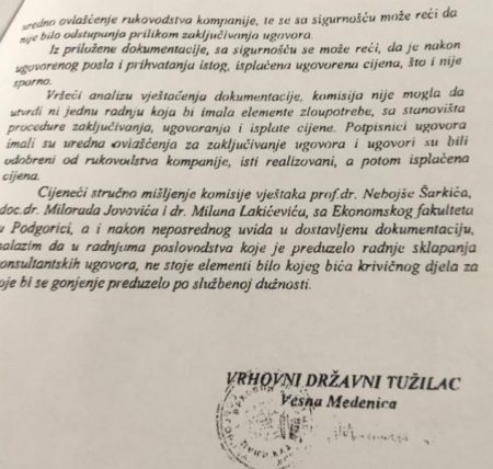 “Vesna Medenica je 2007. godine, na zahtjev tadašnje uprave Telekoma, kao tadašnja Vrhovna državna tužiteljka, konstatovala da nema ništa sporno kod dva konsultantska ugovora, preko kojih su Mađari potplatili prvu familiju da bi za male pare dobili Telekom.