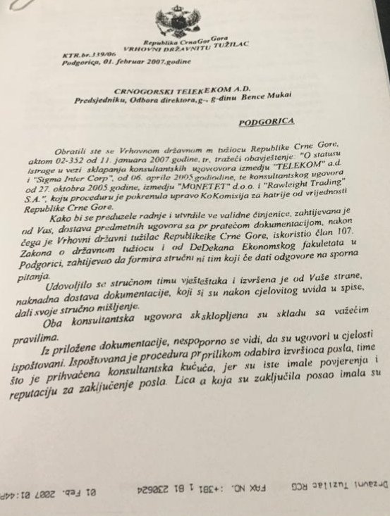 Sve što je Medenica tada radila da bi spasila prvu familiju od afere Telekom koordinirala je Ana Đukanović, odnosno njen brat, tadašnji premijer Milo Đukanović. Tako je i ovaj dokument, koji je Medenica pripremila na formalni zahtjev uprave Telekoma, sa faksa Tužilaštva poslat u kabinet Đukanovića, odakle je i dospio u moj posjed.