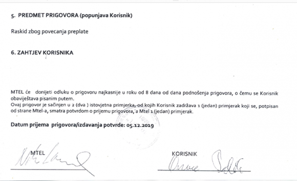 Uredno izmirivši sve obaveze i račune, otkazao sam im ugovor. Ali, ne leži vraže, sledećeg mjeseca mi je sa bankovnog računa skinuto 6.20 eura u korist Telekom-a. Primjetivši to, tražio sam objašnjenje. Bila je greška, objasniše mi fino u Telekom-u, čak su mi se, koliko se sjećam, i izvinili! Međutim, da bi mi vratili novac, rekoše da treba da napišem prigovor.