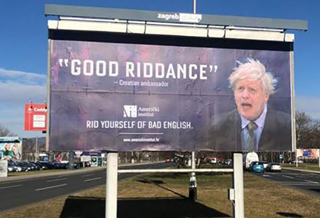 Američki Institut iskoristio je ovaj lapsus da napravi reklamu, pa je na Fejsbuk profilu objavio fotografiju bilborda sa slikom britanskog premijera Borisa Džonsona na kojem piše “Good riddance”, ispod čega je potpisana hrvatska ambasadorka, a ispod toga tekst “Rid yourself of bad english”, što znači “Riješite se lošeg engleskog”.