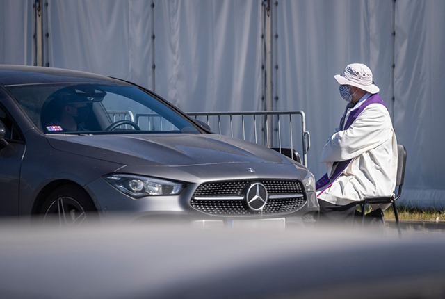 Mateus Kjelarski je osmislio ‘drajv in’ ispovijedanje na parkingu crkve u Varšavi, i tako omogućio vjernicima da traže oprost grijeha pred veliki praznik. Sveštenik zaštićen hirurškom maskom sjedi na stolici na parkingu i sluša vjernike kroz otvoren prozor, prenosi RTS.