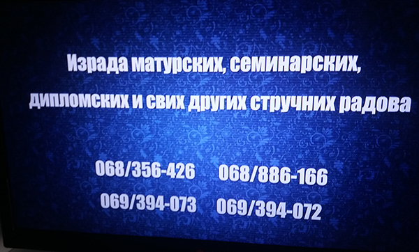 Među oglasima objavljenim nedavno uoči glavne informativne emisije (Pljevaljska hronika) na TV Pljevlja, lokalnom javnom servisu, objavljen je i onaj u kome se zainteresovana javnost obavještava o pružanju usluga izrade maturskih, seminarskih i svih drugih stručnih radova. Sastavni dio oglasa su brojevi telefona – i to čak četiri!