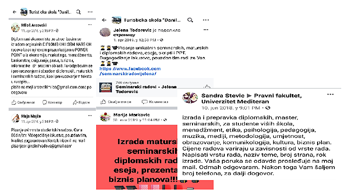 Univerzalni autori radova iz svih oblasti oglase dijele i na Facebook profilima škola i fakulteta. Neki od oglasa budu odmah uklonjeni, a neki ostanu duže na stranici. Takvi su oglasi od 30. maja 2019. i 1. oktobra 2019. godine na Facebook stranici Turističke škole “Danilo Kiš” u Budvi, gdje dvije osobe nude usluge pisanja unikatnih seminarskih, maturskih i diplomskih radova, eseja, skripti i prezentacija, sa preporukom dugogodišnjeg iskustva. Na Facebook profilu Pravnog fakulteta, Univerzitet Mediteran, naišli smo na detaljan oglas od 10. juna 2018, gdje je opisana ponuda i način na koji će poruka naručioca direktno sa ove stranice stići na email adresu sveznajućeg autora radova.