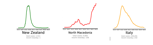Nakon što je početkom maja stavljeno širenje zaraze stavljeno pod kontrolu, broj slučajeva je u junu počeo ponovo da raste. U momentu pisanja ovog teksta, na Worldmeters-u, Makedonija je na 53. mestu u svetu po broju slučajeva na milion stanovnika, a na 34. mestu u svetu po broju preminulih na milion stanovnika.