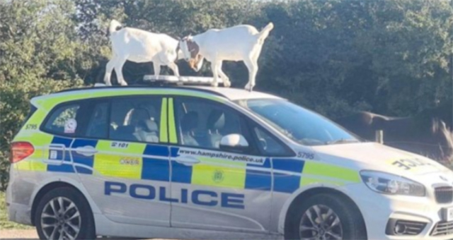 Na ostrvu Vajt u Velikoj Britaniji policija je pokušala da „ulovi“ dva jarca koja odmjeravaju snagu na krovu policijskog automobila.