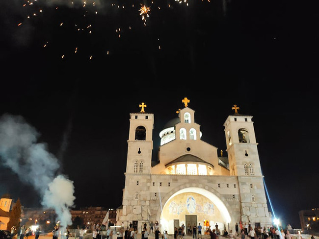 Više stotina građana skupilo se ispred Hrama Hristovog Vaskresenja, gdje su parkirali automobile i slavili kasno u noć uz petarde i vatromete.
