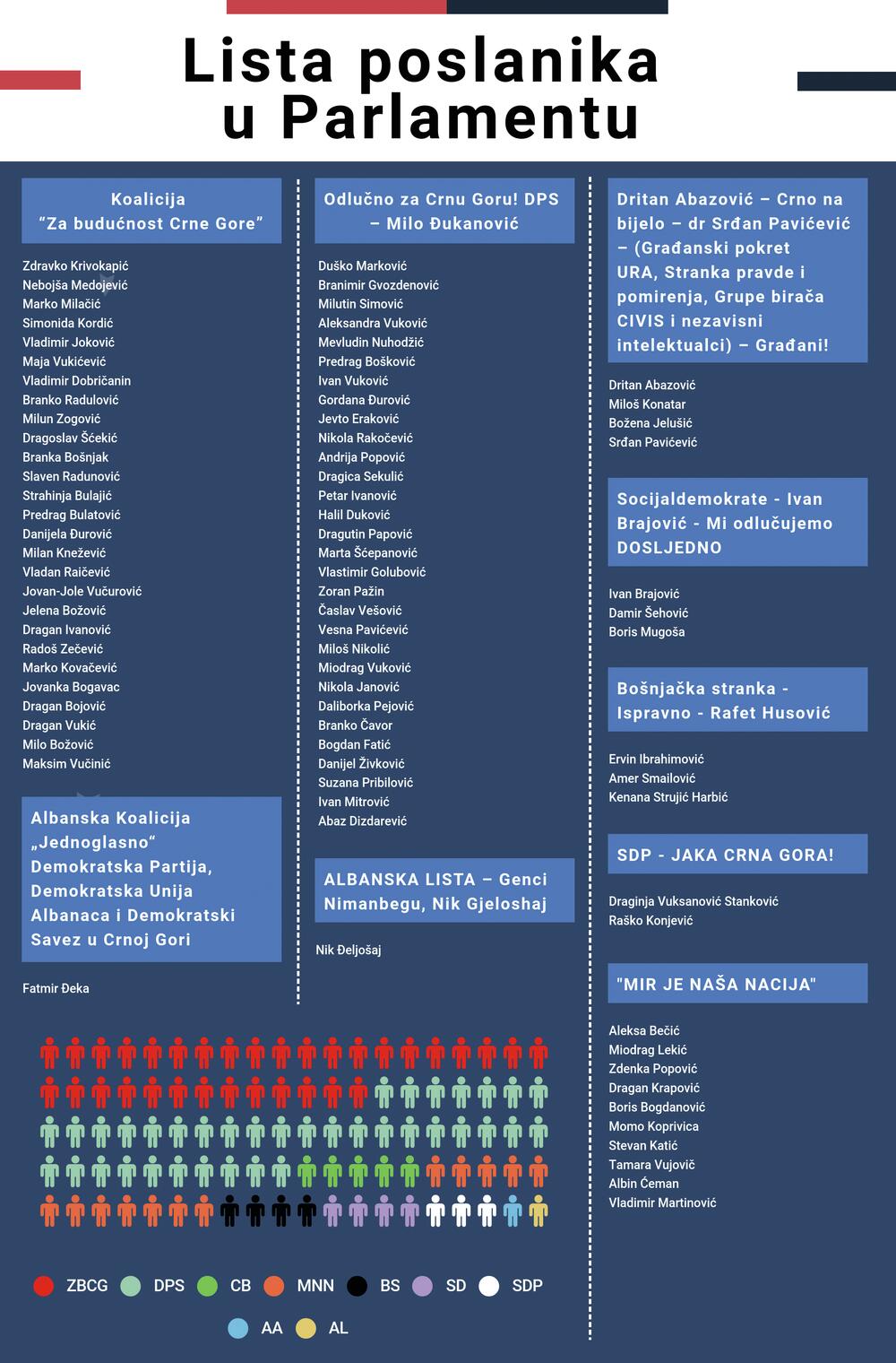 Prema zvaničnim rezultatima izbora, koalicija “Odlučno. DPS – Milo Đukanović” osvojila je 30 mandata, koalicija “Za budućnost Crne Gore” 27, koalicija “Mir je naša nacija” deset, a platforma “Crno na bijelo”, četiri.