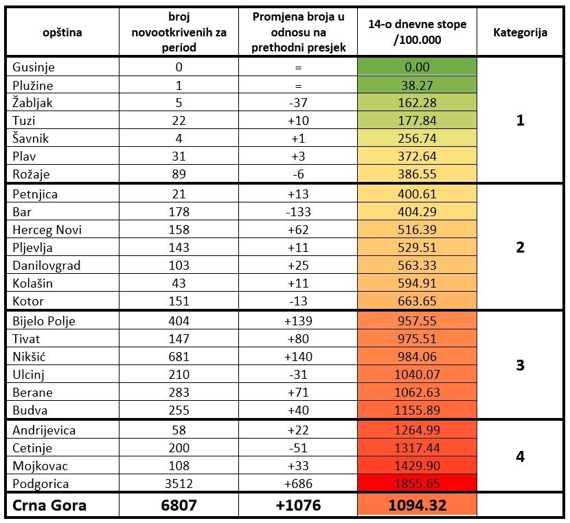 Na osnovu svih registrovanih slučajeva obolijevanja u periodu od subote 31. oktobra u 00:00h do i zaključno sa petkom 13. novembrom 2020. u 24:00 h, izračunate su vrijednosti 14-dnevnih opštinskih stopa kumulativne incidencije za navedeni period i sačinjena je lista opština.