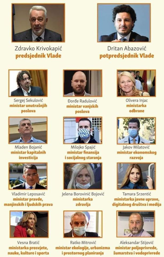 Buduća vlada na čijem Čelu će biti dr Zdravko Krivokapić imaće jedno potpredsjedničko mjesto i 12 ministarstava. Jedini potpredsjednik biće Dritan Abazović, lider građanskog pokreta URA. On će biti zadužen aza koordinaciju sektora bezbjednosti.