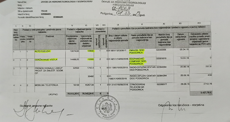 Raičković i Pižurica tvrde da isti automehaničar održava vozila ovog Zavoda od kada su oni zaposleni. Prema ugovorima javnih nabavki koji su dostupni, uvjerili smo se da poslednjih pet godina ZHMS za održavanje vozila angažuje d.o.o Šćepanović COMPANY, a da se kao jedini ponuđač za nabavku “auto djelova” birana firma OMNIOIL DOO.