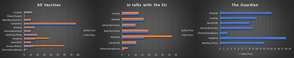 I pored toga što su tačne cene o kojima su različiti dobavljači vakcina pregovarali sa EU verovatno najbolje čuvana tajna u EU, različiti izvori procenjuju niz cena iz javnih i polujavnih podataka. Na sledećoj tabeli možete videti informacije koje su prikupili Ekonomista i Financial Times. Odmah izbrisani tweet belgijske državne sekretarke za budžet, Eve De Bleeker, otkriva još više.