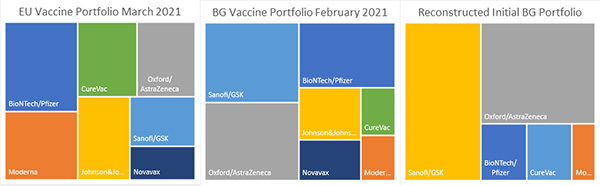 Procenjeno je da je Bugarska „kupila“ unapred oko 13 miliona doza (Tabela za alokaciju EU, BG). Zatim se broj povećao na 18,6 miliona doza. Međutim, EU je Bugarskoj dodelila 42,8 miliona doza. Čak i uz nedostatak potpune transparentnosti, može se uočiti premali udeo obe vakcine koje su bile najbliže odobrenju (u decembru 2020.) i predugo čekanje vakcina koje tek treba odobriti od Sanofi-ja / GSK.S obzirom na raspoloživu uravnoteženu raspodelu – Bugarska je odlučila da se koncentriše na jedno cepivo blizu 40% i odabere samo jedno (pre ugovora sa Švedskom) od dostupnih virusnih vektorskih vakcina.