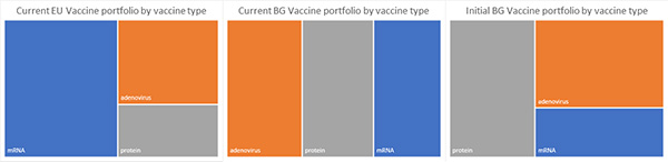 Od mojih obračuna u (Tabeli o raspodeli), čini se da je prvobitni „plan” bugarske vlade bio da naruči jednake delove od cepiva na bazi proteina i virusnih vektora – po 40% i 20% od mRNA vakcina. Morao sam izuzeti Novavax iz kalkulacija, jer još uvek nema ugovora sa njima. Zanimljivo je da je prvobitni plan bio imati sva virusna vektorska cepiva od jednog dobavljača – AstraZeneca. Nakon zahteva od EU i dogovora sa Švedskom, nova raspodela „izgleda” uravnoteženija sa 33% dodeljenih svakoj vrsti cepiva. Međutim, na nivou cele EU alokacija se znatno razlikuje, sa 50% dodeljeno mRNA, 30% virusnim vektorima i 20% vakcinama na bazi proteina. Ova je raspodela aktuelna od marta 2021. godine i verovatno će se promeniti uvođenjem novih informacija. Dodela se verovatno temelji na činjenici da su mRNA cepiva prva odobrena za upotrebu u celoj EU, dok su cepiva na bazi proteina još uvek u kasnoj fazi razvoja.