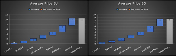 Na osnovu mojih obračuna i podataka dostupnih u ovoj fazi, stvorio sam grubu sliku cene portfelja cepiva EU i Bugarske. Ukoliko portfelj EU košta oko 11 EUR po dozi, bugarski bi iznosio 9 EUR po dozi. Pretpostavljam da je „ušteda“ od 2 EUR po dozi (18%) indikativna za cenu koju je bugarska vlada postavila svojim građanima. To su uštede odabirom portfelja sa pretežno jeftinijim cepivima umesto uravnoteženog portfelja svih dostupnih vakcina.