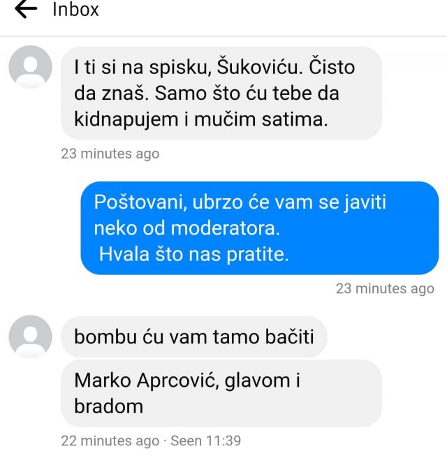 “I ti si na spisku Šukoviu. Čisto da znaš. Samo ću tebe da kidnapujem i mučim satima. Bombu ću vam tamo bačiti. Marko Aprcović, glavom i bradom”, napisao je Aprcović u poruci koju je poslao zvaničnoj Facebook stranici Antene M.