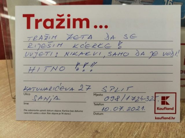 U jednom prodajnom centru u Splitu osvanula je neobična poruka u kojoj Splićanka traži muža za svoju kćerku.
