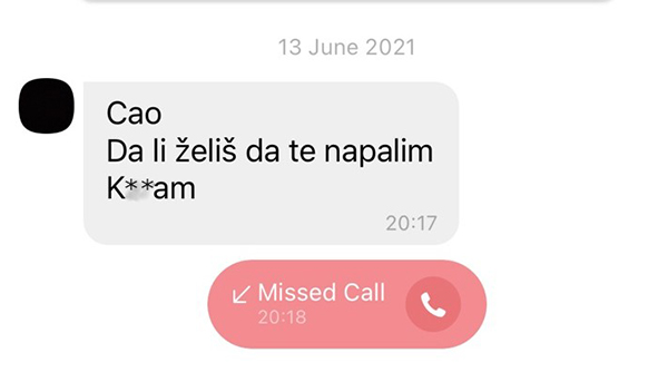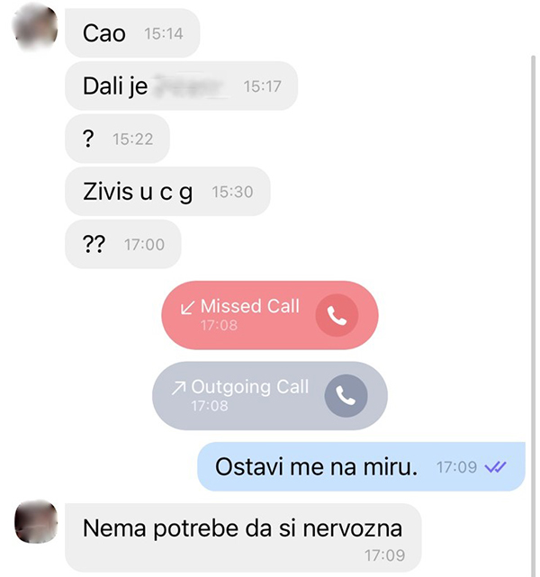 ”Našla sam se u nezgodnoj situaciji jer sam počela da dobijam poruke neprikladnog sadržaja, koje nemaju nikakvih dodirnih tačaka sa mnom. Sve se odvijalo na Viber-u, uglavnom, takođe i na WhatsApp-u, ali u mnogo manjoj mjeri, a u pitanju su bili muškarci iz Srbije, kao i iz Bosne i Hercegovine“, kaže ona.