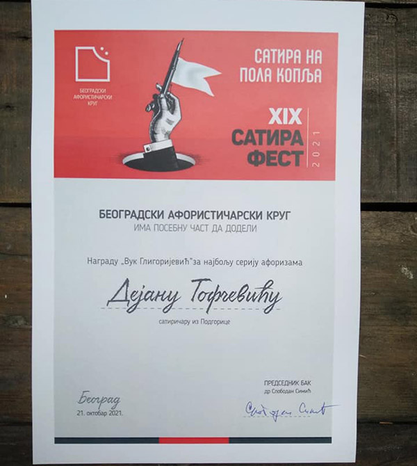 Dejanu Tofčeviću nagrada Satira Festa za aforizam
