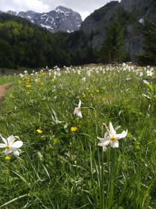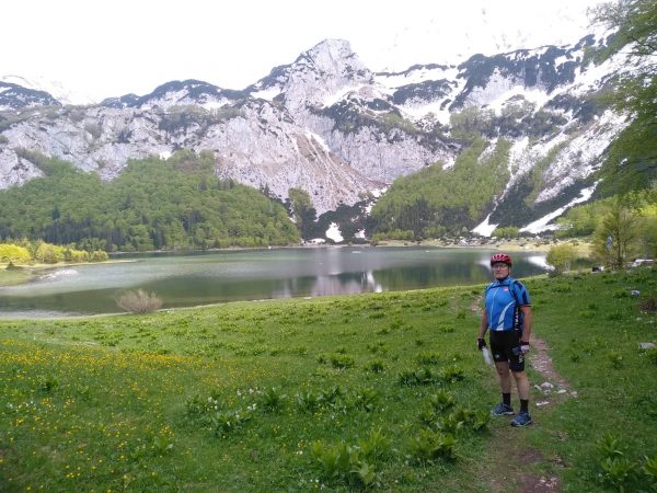 Kada videsmo da više nema leba od vožnje ostavismo konje u šumi i nastavismo peške. U dolini zatekosmo baru okruženu prelepom cvetnom livadom kojom dominirahu miris i lepota narcisa, ali brzo nastavismo uzbrdo kroz šumu sa kamena na kamen i nakon pola sata markiranom stazom izbismo na Trnovačko jezero. Bez daha nas ostavi lepota jezera ugnežđenog između planinskih vrhova, mada je i uzbrdica koja vodi dovde imala svoj udeo u tome. Na obali jezera je kućica u kojoj upoznasmo jednog Ćalasana koji je čuvar i popismo sa njim po domaću travaricu sa šest trava iz okoline jezera. Probasmo mi i ovu našu mučenicu sve kroz ugodan razgovor. Kod njega bi se moglo i spavati jer ima možda petnaestak kreveta ali nama to nije bilo potrebno jer se vratismo biciklima koji su nas verno čekali u šumi tamo gde su ostavljeni.