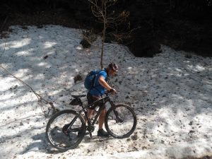 Nakon desetak kilometara od rampe se nalazi veliki parking na kojem jedan bradati gotostas pitome naravi Aškraba dežura. Tu se desi susret verovatno dva najređa prezimena igde. Ovo mesto se zove Dragoševo sedlo. Dvestotinak metara odatle se nalazi divan vidikovac odakle se u daljini može videti impozantan vodopad Perućice za koji neke devojke koje zatekosmo tamo kažu da je visok 70 metara. Posle toga nastavismo uzbrdo i skretosmo sa glavnog puta ka Prijevoru koji se nalazi na 1600 i kusur metara. Na izlasku iz šume nam se ukaza gorostasni Volujak, još uvek pod debelim snegom, koji sa okolnim vrhovima čini jedan veliki amfiteatar. Odatle se makadamski put spušta u dolinu, a mi veseli vičemo i osluškujemo eho naših prilično hrapavih glasova. Posle možda kilometar-dva naiđosmo na sipar koji je potpuno uništio put pa se dalji nije moglo ni biciklom već smo ih morali nositi preko nekih delova koji nisu bili potpuno bezopasni ni za pešake. Posle sipara se moglo vozitu i kroz šumu ali opet zbog lošeg puta se silazilo i teglilo, nosalo i upiralo.