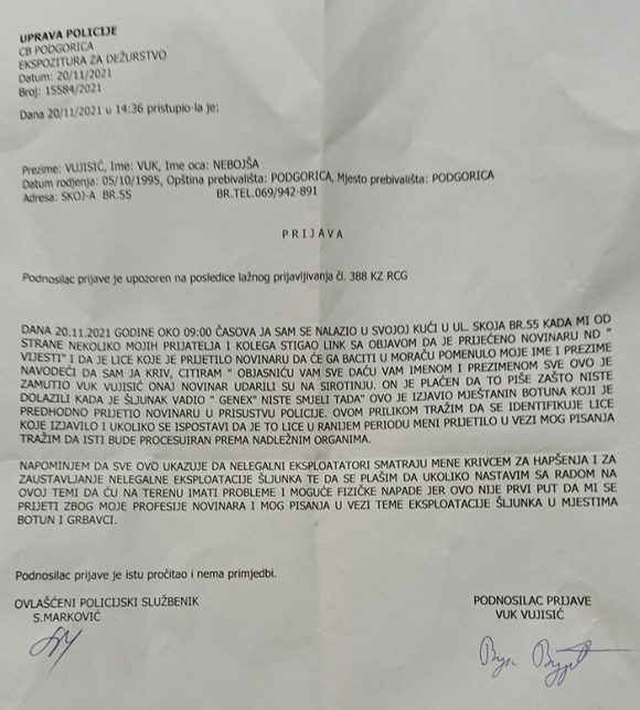 Malo je što kradu državno dobro devastirajući rijeku Moraču i ugrožavajući vodosnabdijevanje primorja, nego još i prijete. Krive nas novinare, a iz više izvora čujem da targetiraju mene lično kao krivca za sprječavanje ilegalne eksploatacije šljunka i hapšenja.