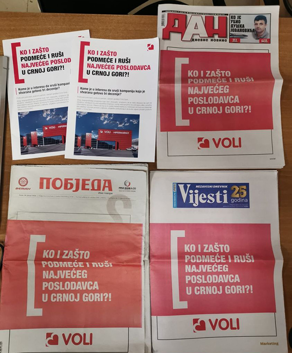 Ova poruka kompanije crnogorske ‘Voli’ objavljena je danas na naslovnicama sva tri crnogorska dnevna lista – Vijesti, Dana i Pobjede.