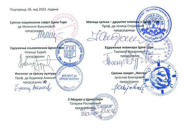 Као представници српских организација из области културе, науке и медија у Црној Гори принуђени смо да од вас, званичних представника државе српског народа, затражимо заштиту од очигледно пројектоване асимилације и дискриминације које озбиљно пријете да трајно поремете националну, вјерску и језичку структуру српског становништа у Црној Гори.