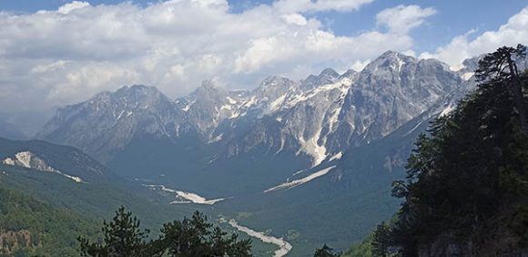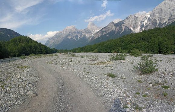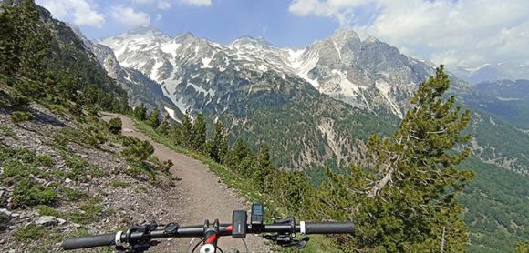 S lijeve strane se ukazivao puteljak koji nije obećavao da se njime može pedalati . Ubrzo smo shvatili da je to najljepše parče planinarske staze kojom se silazi u dolinu Valbone, nad čijim amfiteatrom stražare fascinantni vrhovi viši od 2500 metara nadmorske visine. Iz dubine nas je dozivalo belo isušeno korito kojem se odazivao GPS trek sa našeg uređaja, a i mi sa biciklima u rukama u ovoj nedođiji.