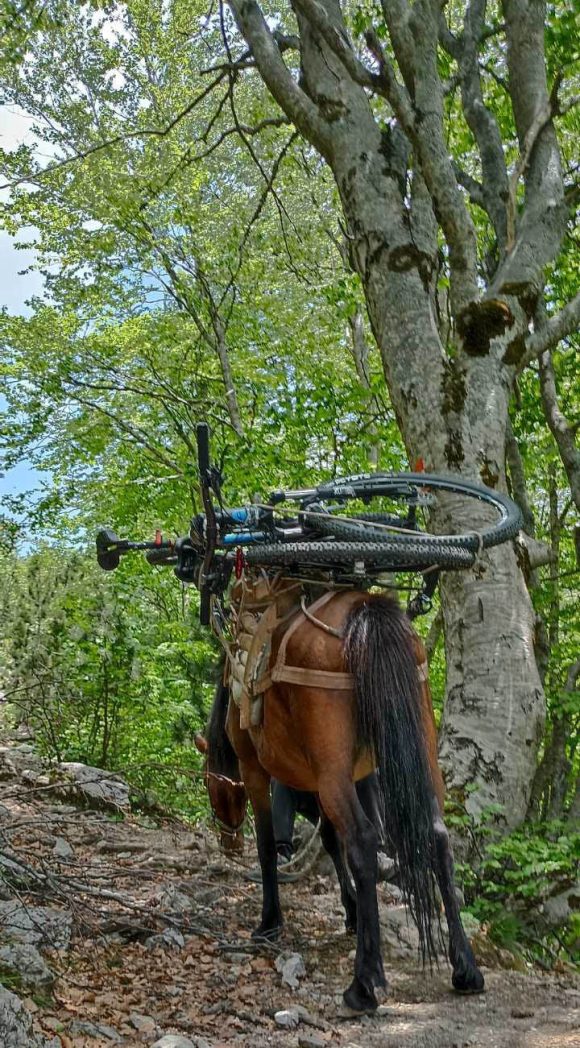 Negdje na sredini uspona put je prepriječila velika, pala bukva. Nije to bio problem za čeljad jer je bila pogodna za spuštanje stražnjice i udoban odmor, ali jeste za umornu kobilu. Geg je povukao za ular, a ona se nećkala, nesigurna u svoju snagu. Onda je krenula, zapela zadnjim nogama za palo deblo, spotakla se i zanijela, ali je, srećom, ostala na nogama i naša bicikla na njenim leđima. Kasnije se konjovodac pravdao da bicikli nisu oštećeni ali pri ovako mučnoj sceni to nam i nije padalo na pamet.