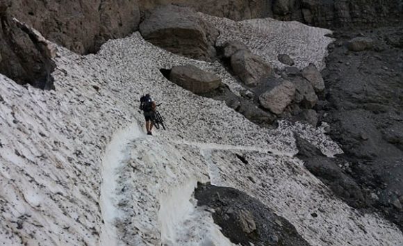 Ispostavilo se da je uspon bio pjesma u odnosu na silazak jer je teren bio krševit i od rasutog materijala, uz poneki preživjeli sniježni namet, pa je bilo prilično teško nositi kabaste planinske bicikle i rance sa potrepštinama za nekoliko dana. Svaka opuštenost je mogla biti kažnjena klizanjem i padom. Nekoiko puta smo nailazili na staze gde se činilo da je moguće voziti bicikl barem neko vreme, ali bi uvek nakon nekoliko desetina metara naše nade bile razvejane jer bi put postajao još gori i teži za prolazak.