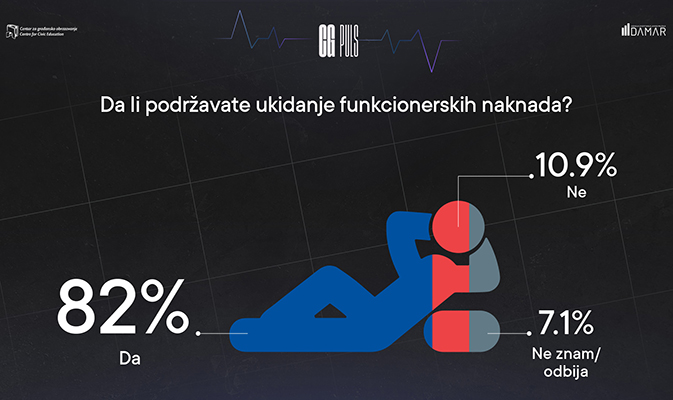 CGO podsjeća i na decidran stav javnog mnjenja u Crnoj Gori u vezi sa ovom vrstom privilegija, što pokazuju i podaci iz februarskog CG pulsa, zajedničke inicijative agencije DAMAR i CGO-a. Čak 82% građana i građanki smatra da funkcionerske naknade po prestanku funkcije treba ukinuti.