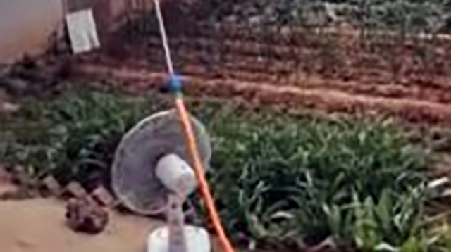Oon je na vrh malo stonog ventilatora prikačio crijevo i uključio ga, tako da se sa okretanjem ventilatora kretala i voda i polivala (skoro ) sve djelove njegove bašte.