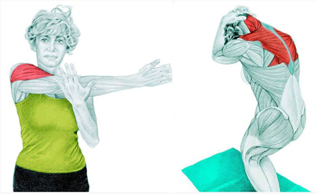 Ciljani mišići: M. Deltoideus pars spinata. Postavite ruku preko tijela i drugom rukom lagano pritiskajte u nivou lakta da bi pojačali istezanje ramenog mišića.