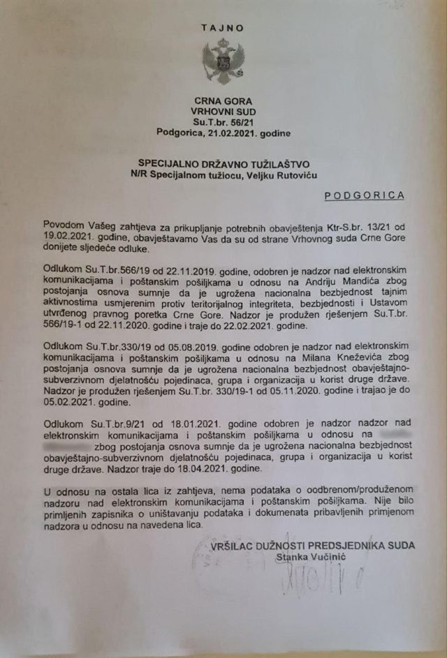 Knežević objavio dokument da je prisluškivan od 2015. godine