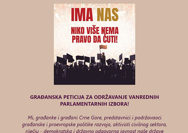“Nama, građankama i građanima Crne Gore, Ustav garantuje pravo da branimo svoju državu i njeno ustavno uređenje. Zato, u skladu sa članom 92 Ustava Crne Gore, zahtijevamo da poslanici hitno pokrenu postupak i donesu odluku o skraćenju mandata Skupštine, kako bi se obezbijedilo održavanje vanrednih parlamentarnih izbora”, kaže se u tekstu peticije.