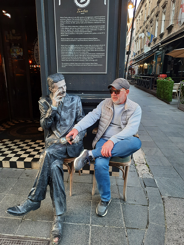 Svakodnevno više puta prođem sarajevskom ulicom pored kafića, gdje na trotoaru, u prirodnoj veličini, zamišljen, sa sijalicom u ruci, sjedi Nikola Tesla. Nikada ne prođem a da ga ne pozdravim. Da li je to razlog, ne znam, ali sinoć me u snu zijareti gospodin Nikola Tesla. Samo što ga ugledah upitah: