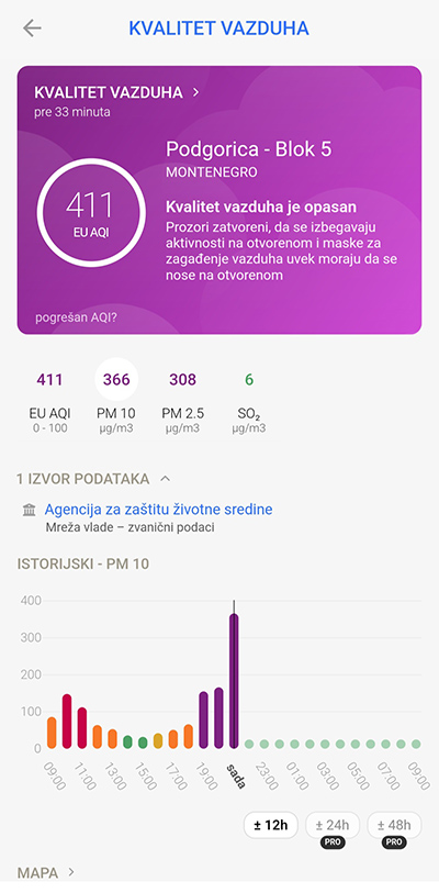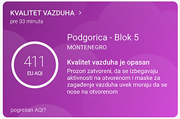 “Prozori zatvoreni, da se izbjegavaju aktivnosti na otvorenom i maske za zagađenje vazduha uvijek moraju da se nose na otvorenom, navodi se u aplikaciji”.