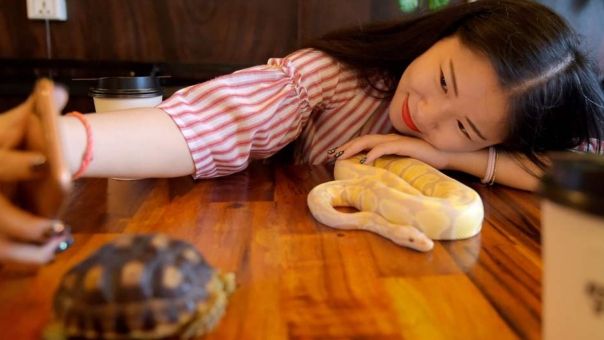 Bradati varani, leopardovi macaklini i razne zmije su među vrstama koje se odmaraju u staklenim terarijima u Japovom kafiću u predgrađu glavnog grada Malezije Kuala Lumpura.