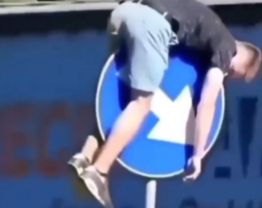 Mladić je “zaspao” na saobraćajnom znaku. Niko ne zna kako je dospio tamo, jesu li u pitanju pijana posla ili je mladić ovo napravio namjerno kao bi skupio koji lajk.