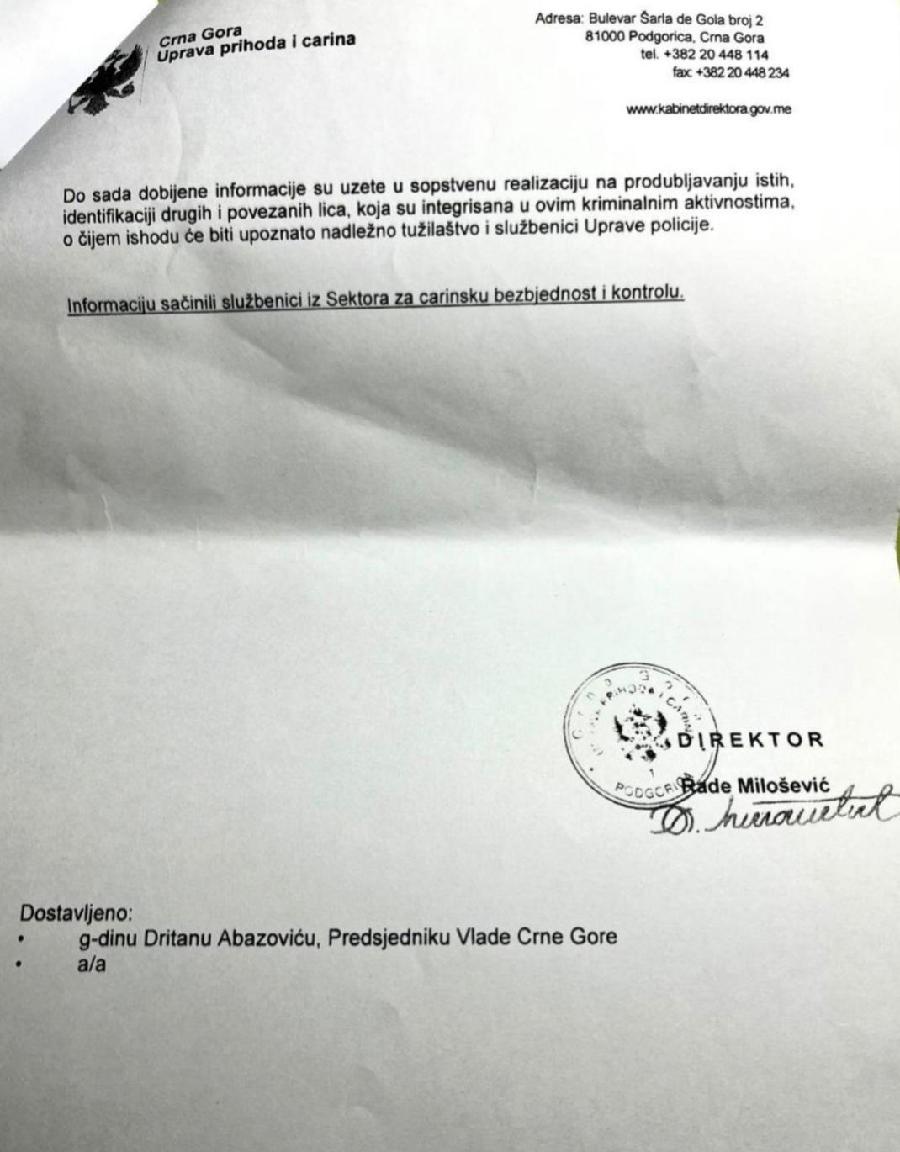 Nekadašnji direktor Uprave prihoda i carina Rade Milošević, osumnjičen da je učestvovao u švercu cigareta, u dopisu premijeru Dritanu Abazoviću optužio je firmu ‘Bemaks’, Ranka Ubovića i Aleksandra Mijajlovića da su umiješani u krijumčarenje cigareta u Crnoj Gori.