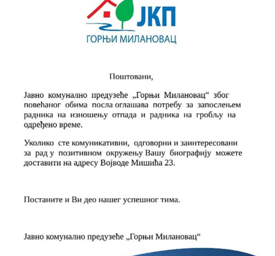 “Javno komunalno preduzeće “Gornji Milanovac zbog povećanog obima posla oglašava potrebu za zaposlenjem radnika na iznošenju otpada i radnika na groblju na određeno vrijeme. Ukoliko ste komunikativni, odgovorni i zainteresovani za rad u pozitivnom okruženju Vašu biografiju možete da dostavite na adresu Vojvode Mišića 23. Postanite i vi dio našeg uspješnog tima”, pisalo je u oglasu koji je brzo uklonjen.