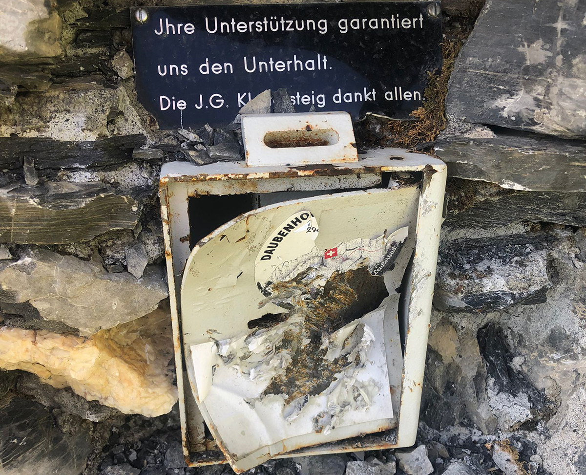 Kutija za donacije, koju je postavio planinarski klub Lejkerbad, nalazi se u blizini vrha Daubenhorna u švajcarskim Alpima.